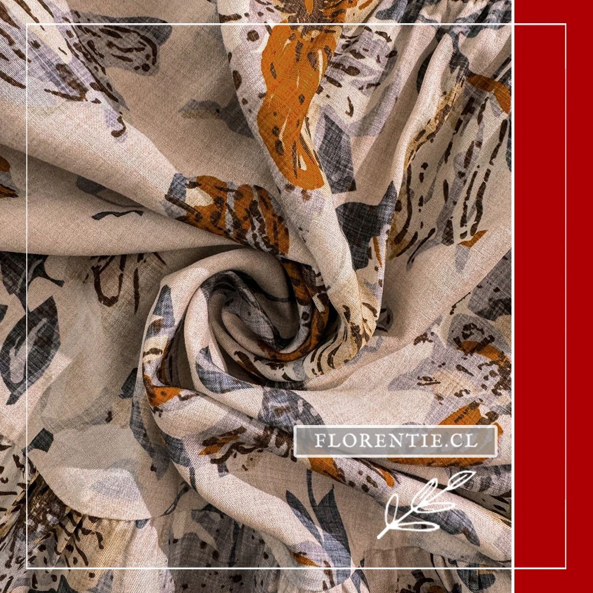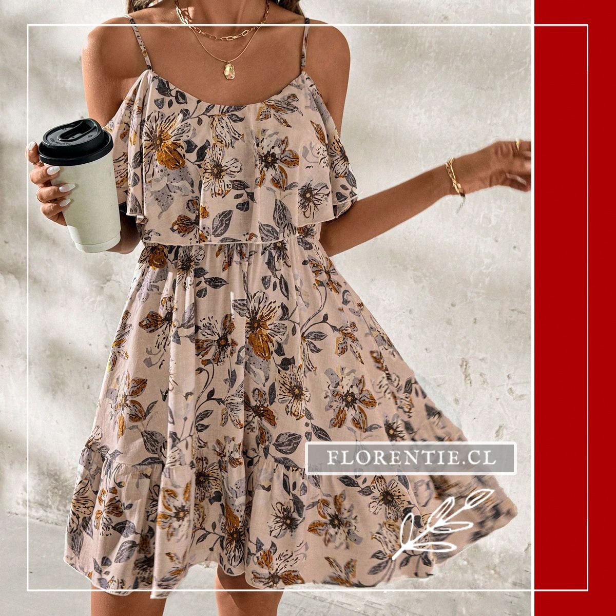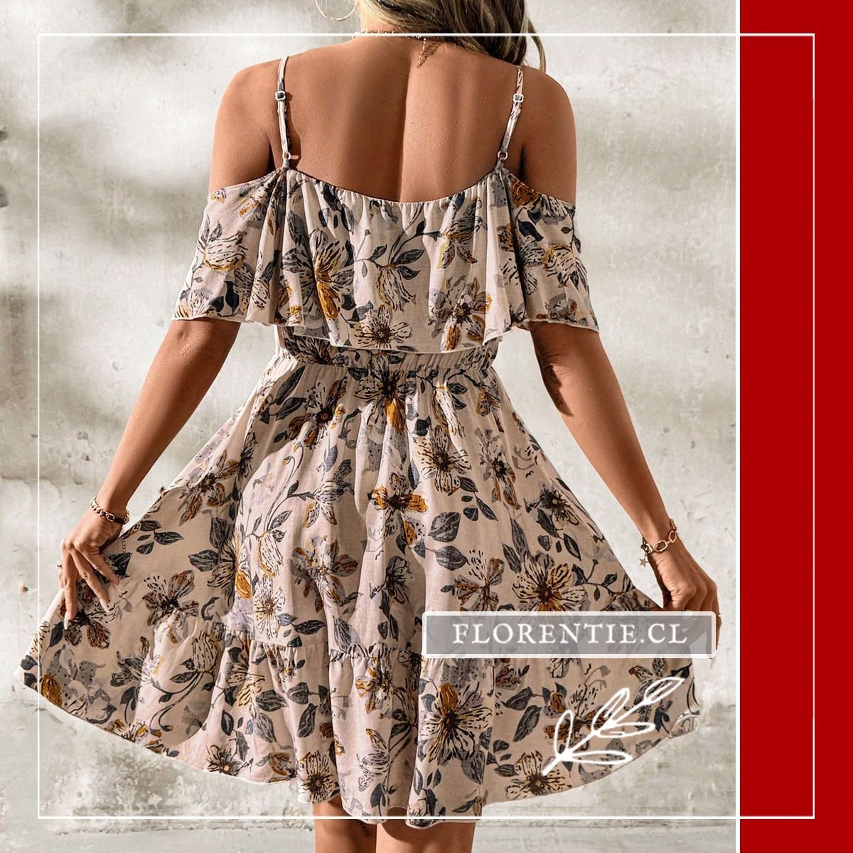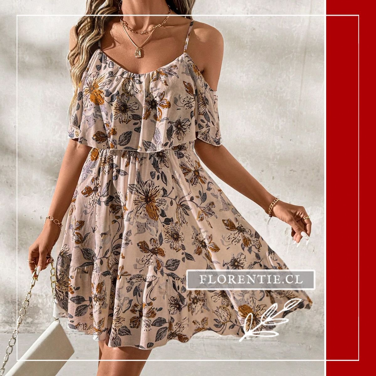 Este vestido corto de silueta en A posee un escote off-shoulder con un volante superior y tirantes ajustables. Su cintura elástica fruncida y falda de tres niveles con volantes crean una figura favorecedora y llena de movimiento. Confeccionado en tela ligera, luce un vibrante estampado de flores grandes en tonos mostaza y naranja. Ideal para una boda al aire libre, una cena de verano o cualquier evento donde quieras destacar con un estilo boho-chic fresco y femenino.