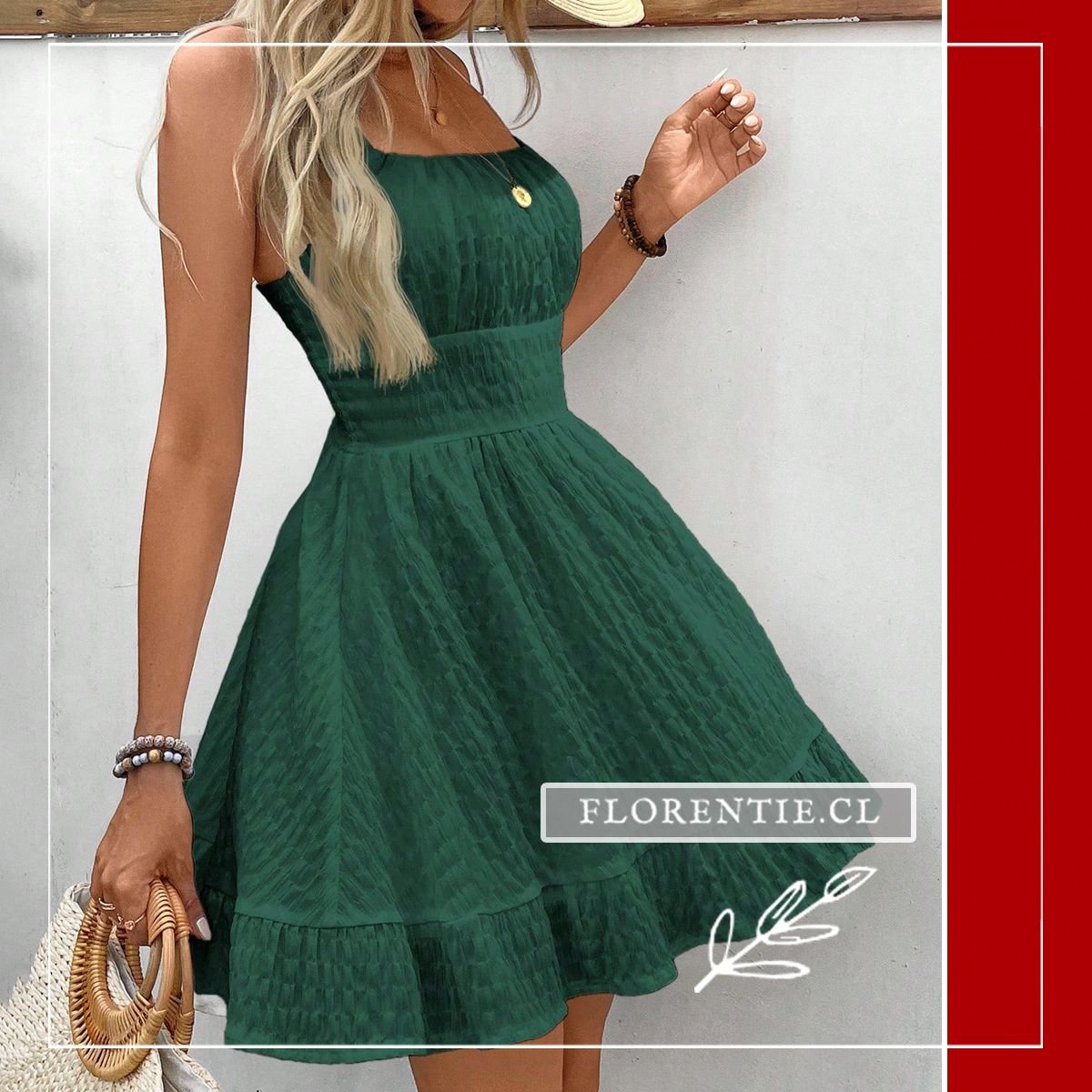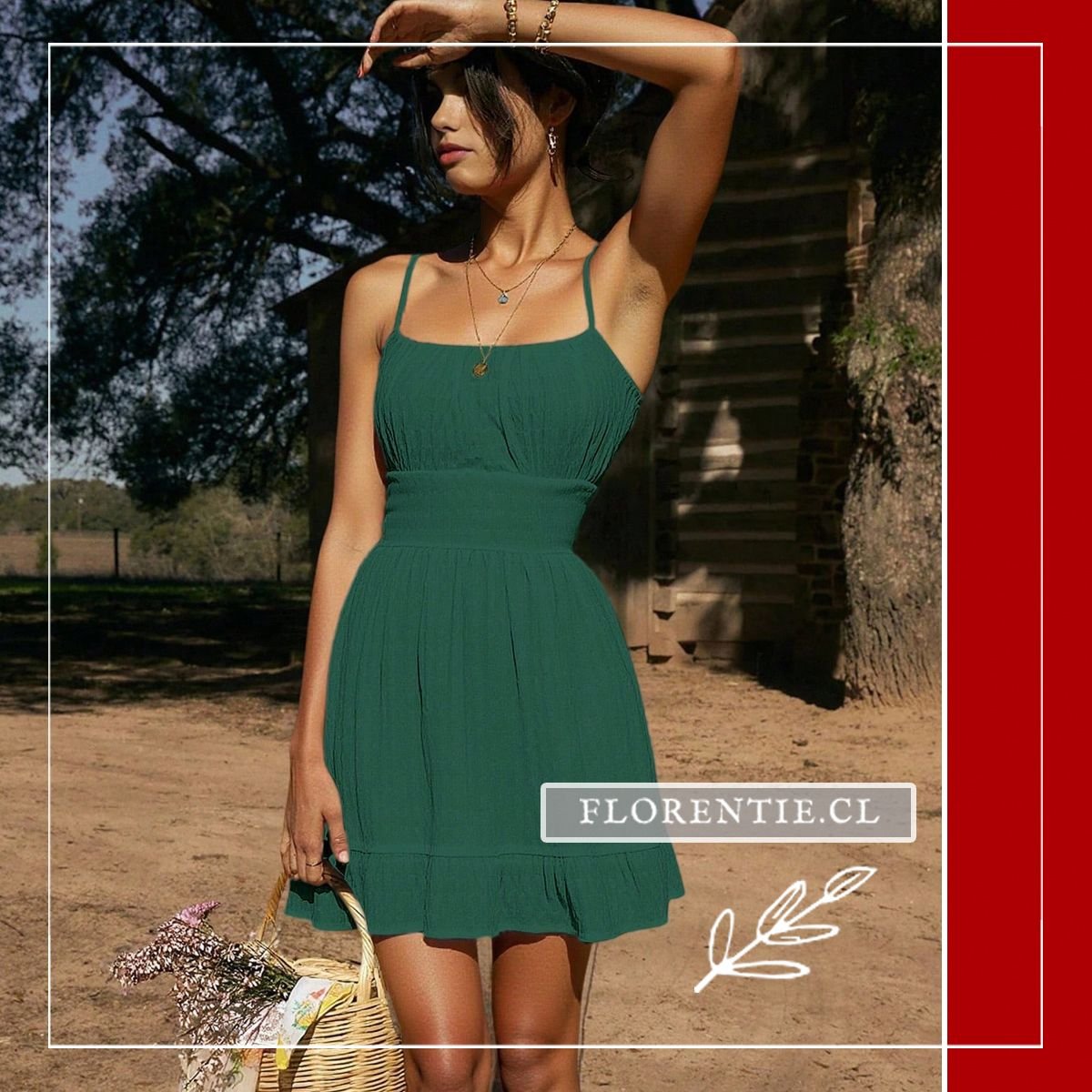 Este vestido mini de silueta en A combina un escote recto con tirantes ajustables y busto fruncido para un ajuste perfecto. La cintura está marcada con una banda ancha, mientras la falda con volantes superpuestos ofrece un movimiento fluido y aireado. Confeccionado en tela vaporosa verde esmeralda con textura de puntos, es ideal para eventos diurnos, como una boda campestre, una fiesta en jardín o una salida casual, fusionando comodidad y un toque romántico con elegancia.